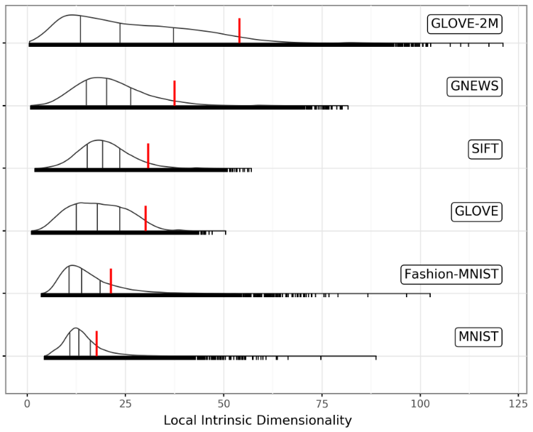 Недавно открыл вот эту статью, где увидел вот такую картинку. На ней показано распределение локальных внутренних размерностей (ЛВР далее) для некоторых датасетов, среди которых есть SIFT1M. Этот датасет — частый гость в статьях про поиск ближайших соседей. Вы спросите «И че?». Первая тема моего диссера была как раз по knn. Считаю своей главной находкой то, что многие эмбеддинги можно довольно сильно сжать каким-нибудь PCA, при этом не особо теряя в качестве поиска. Правда, понять, где предел этого сжатия я так и не смог, потому тему решил задвинуть. Но вот нашлась интересная гипотеза.