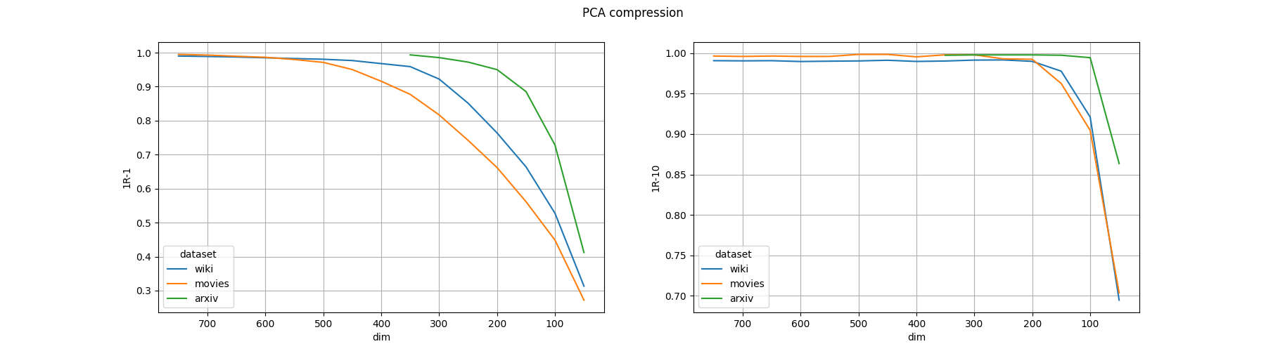 Отмечу сам по себе факт, что вы можете обычным PCA снизить размерность почти в двое в случае 768 эмбеддингов и держать качество поиска на 95 процентах по 1R-1, а если вам достаточно, чтобы истинный ответ находился хотя бы в топе 10, то и вовсе в 5 раз.