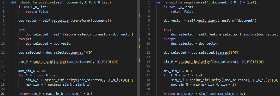 Есть еще места, которые слишком буквально идут по алгоритму из статьи. Например, в одном месте вместо того, чтобы на матрицах считать косинусное расстояние для набора документов, оно считается циклом — так показано в алгоритме в статье. Другой пример, найдите отличия: